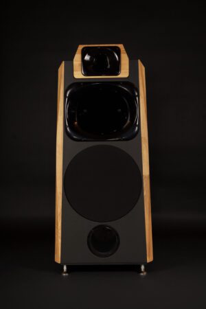 La section médium-aigu est confiée à deux chambres de compression (médium 1,4 pouce et tweeter 1 pouce) assurant une cohérence de phase parfaite et une projection contrôlée. Cette architecture 3 voies avec deux deux chambres de compression permet d’obtenir une sensibilité très élevée de 98 dB. Concrètement, cela signifie que l’enceinte est extrêmement facile à alimenter : un amplificateur à tubes de quelques watts suffira à la faire chanter, tandis qu’un bloc de puissance à transistors en exploitera toute la dynamique sans jamais l’essouffler.
