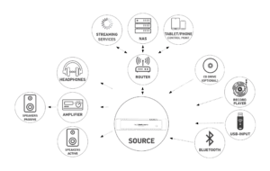 Il intègre tous les services de streaming tel que TIDAL Qobuz Deezer Spotify et est ROON ready. Vous pouvez jouer aussi les Radio. Pour compléter le tout, il possède aussi une entrée phono MM et une sortie casque (6.35mm)